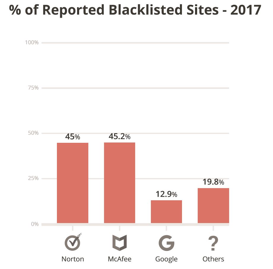 This becomes even more evident when you look at the detection effectiveness across the different authorities. Of the 17%, Google only made up 12.9%; while Norton and McAfee both maintained 45% detection share.