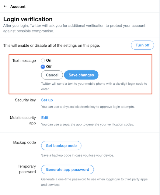 - Lastly, do not forget to disable SMS 2FA authentication. If you leave SMS enabled it'll work in tandem with your authentication application. To do this, on your security and privacy page click edit and select the OFF option