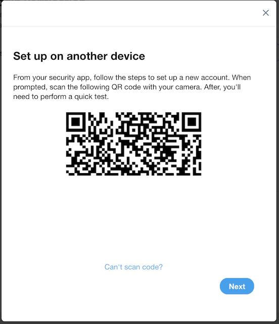 - Use your favorite mobile authentication app and scan the code. Do not forget to VERIFY the code inside of Twitter, it does not activate until verified.
