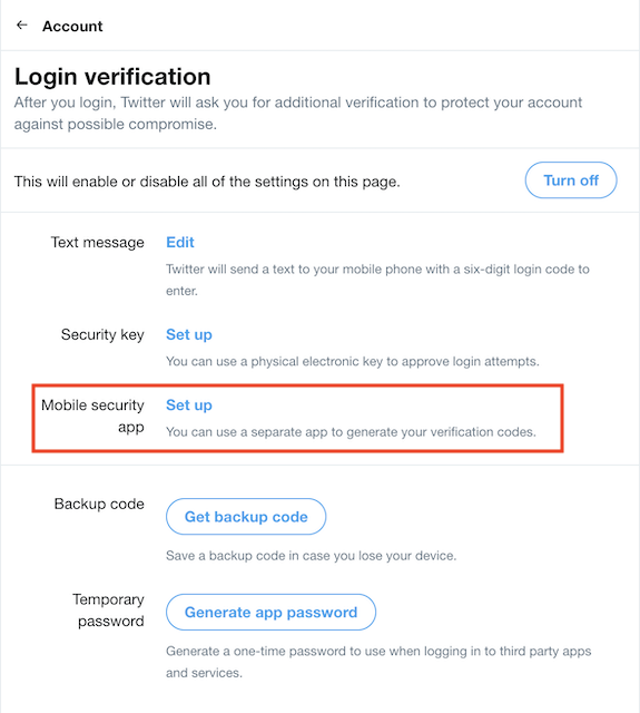 It is recommended you leverage Time-based One-Time Password applications (e.g., Authy, Google Authenticator) for your 2FA needs. Unfortunately, doing this on the Twitter application requires multiple steps. This guide will walk you through the process.How to Set up 2FA With OTP Applications (e.g., Google Authenticator)