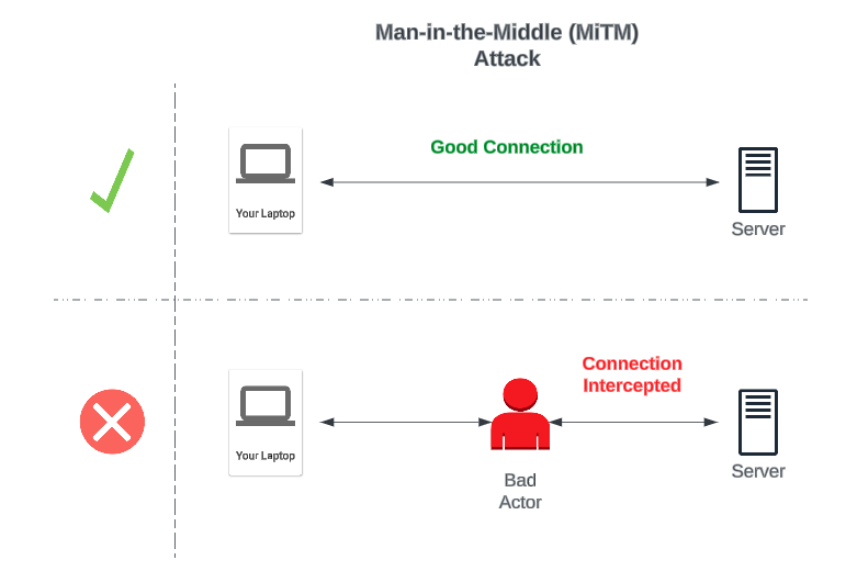 If you have ever been pitched the need for a VPN solution, you have undoubtedly been pitched the idea of someone stealing your information while you peacefully enjoy a cup of Joe at your local Starbucks. The premise of this threat is that a bad actor can intercept your traffic on public Wi-Fi. This interception is known as a Man-in-the-Middle (MiTM) attack.