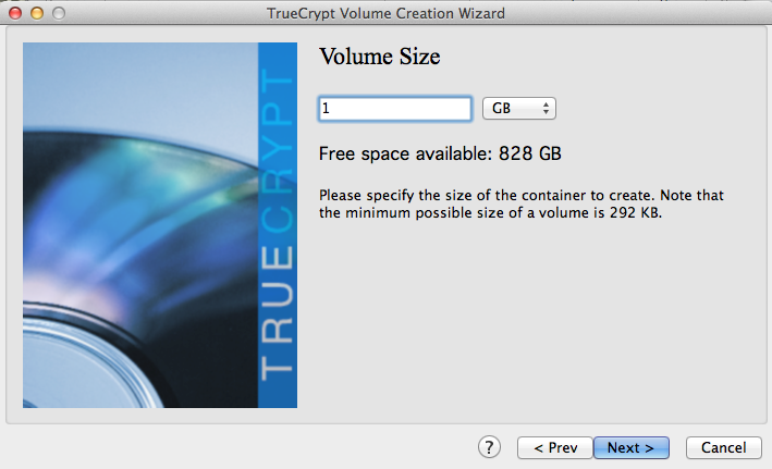 The next page is important, it asks you to define the size of the container. This size defines the amount of content you can put in the bucket. If you're trying to protect pictures or videos you might be looking at a fairly big container, and that's ok, but if you're looking to use it with Dropbox make sure your account has enough space.
