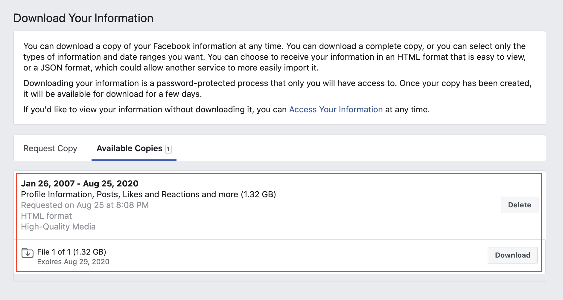 Click on "Download Your Information". This will take you to a page that allows you to download every thing. It includes posts, pictures, videos, etc.. I was actually pleasantly surprised with the amount of content it gives you access to.